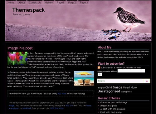 themespackEscape Wordpress Theme comes with the following features:* Widget Ready,cloud,adsense ready. a free Wordpress theme which was recently released. It is fully compatible with wordpress 2.3.2 and has tagging and tag cloud enabled.
