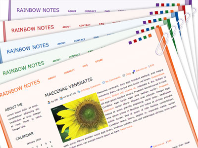 Effi Author's Demo XHTML Transitional Valid CSS WordPress 2 Themes 2 Columns Fixed Width CSS-Based Layout Rainbow Notes Wordpress Theme. Featuring five color options: purple, red, blue, green, and orange. Clean, simple and white, in 2 column layout. Widget ready and top navigation.