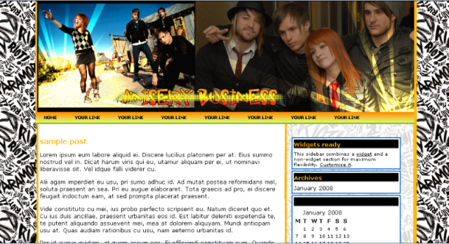 free themes Author's Website Valid CSS WordPress 2 Themes 2 Columns Fixed Width Table-Based Layout Inspired by the band Paramore and their song Misery Business, I came up with this wordpress theme idea. I always wanted to create a site that is easy to update, and to make that possible, using wordpress as your content management system is the best thing to do rather than modifying your html or php files one by one. So here it is - Misery Business : Wordpress Theme!